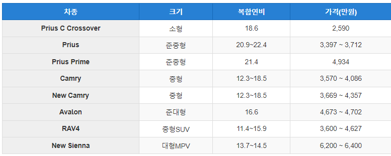 토요타 하이브리드 차량의 종류, 가격, 연비입니다.