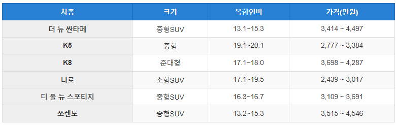 위 표에는 현재 존재하는 모든 하이브리드 차량의 종류, 연비, 가격이 정리되어 있습니다.