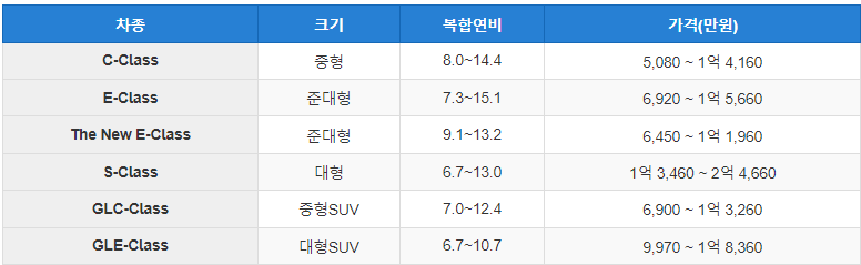벤츠 하이브리드 차량의 가격과 연비입니다.