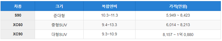 그리고 볼보 하이브리드 차량의 가격, 연비를 나타낸 표입니다.